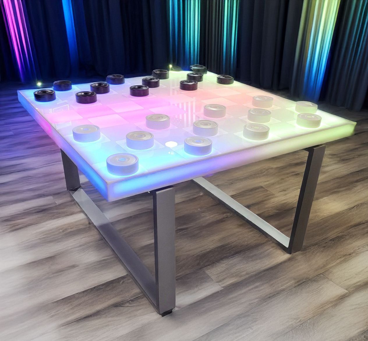 Our Glow Checkers will dazzle your guests and keep the energy alive all night, whether you’re looking to create a unique vibe or an glow game night. Take your gaming to new heights with our SUPER-GLOW LED Checkers Tables—the ultimate addition to any event! Featuring moving light technology, every part of the table-tops GLOW! Let us help you craft a high-energy, unforgettable experience that will engage and excite all your guests.