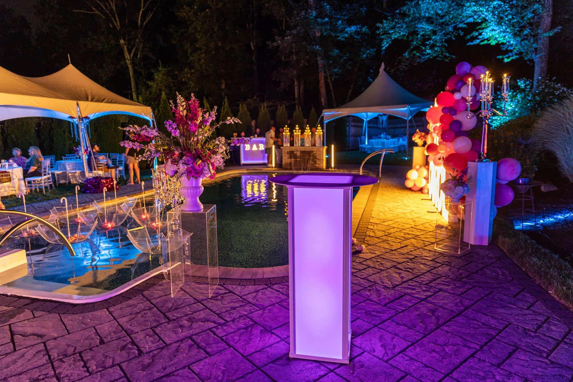 Our lighting concepts create a effect that truly stands out. Whether we're accentuating the elements establishing points or enhancing the ambiance, with colors our lighting options bring richness and texture to your event venue.
